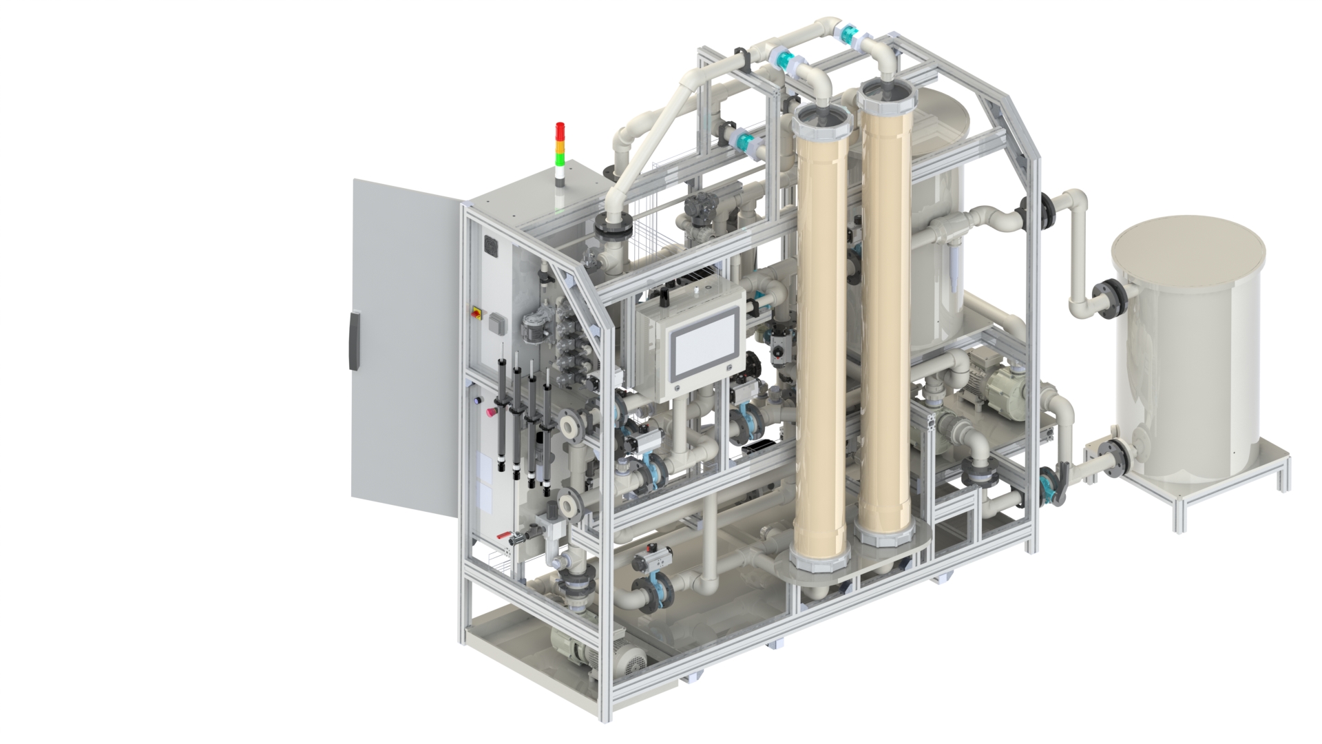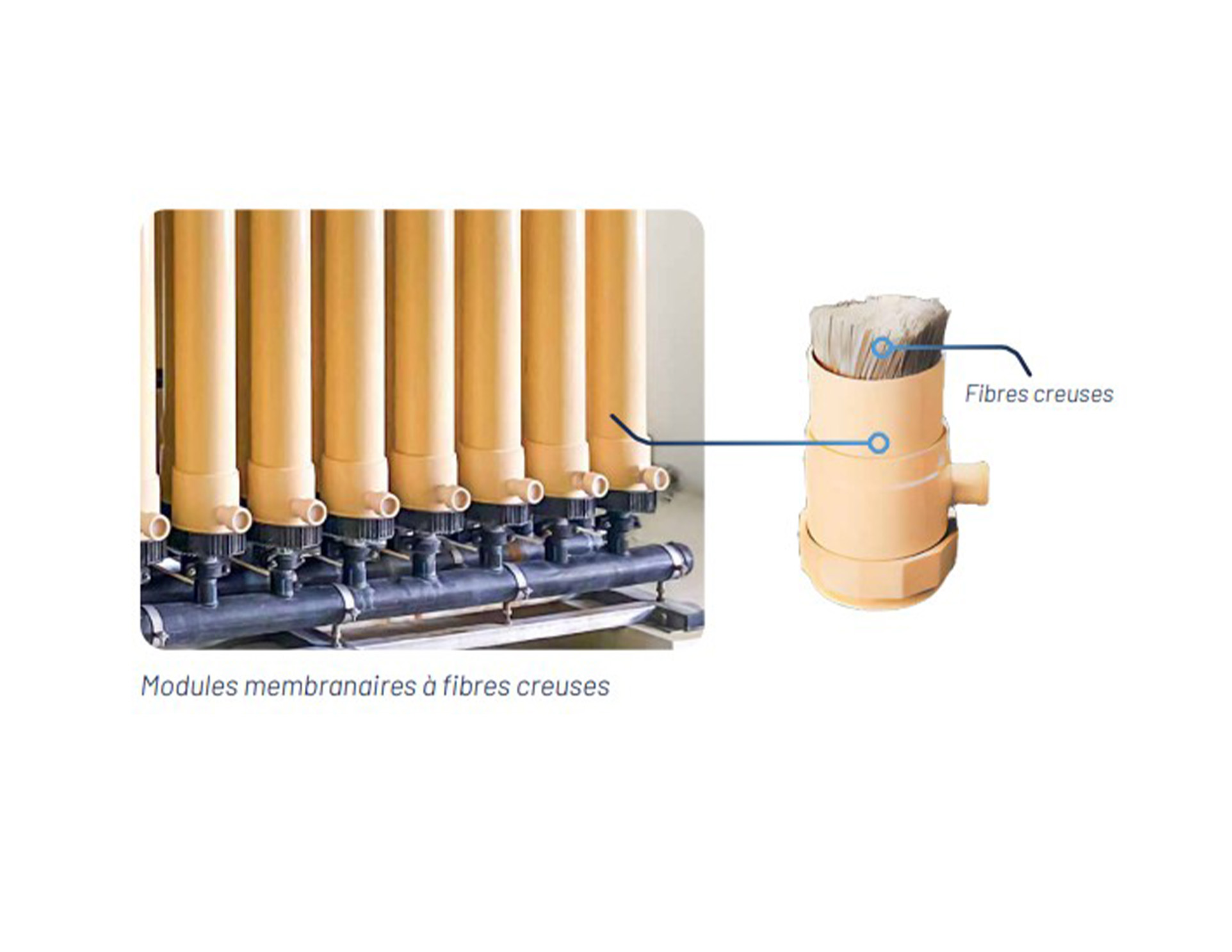 L’eau brute est introduite à la base du module, traverse les fibres creuses pour ressortir sous forme d’eau traitée. Le système comprend un circuit de rétro-lavage automatique pour maintenir les performances du module et prolonger sa durée de vie.